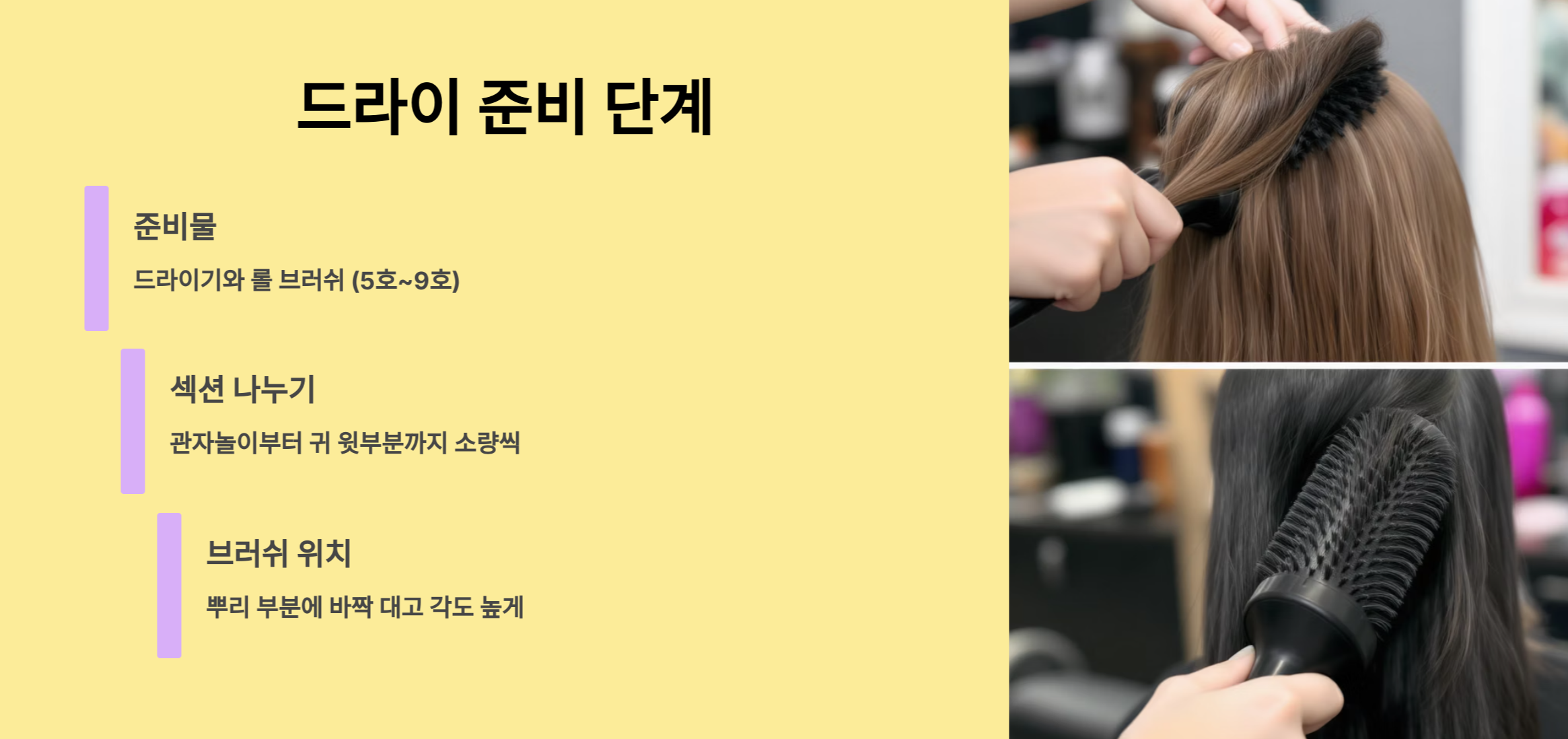 이제 집에서 직접 옆머리 볼륨을 만드는 방법을 단계별로 쉽게 알려드릴게요. 준비물은 드라이기와 롤 브러쉬 (5호~9호 사이즈)입니다.