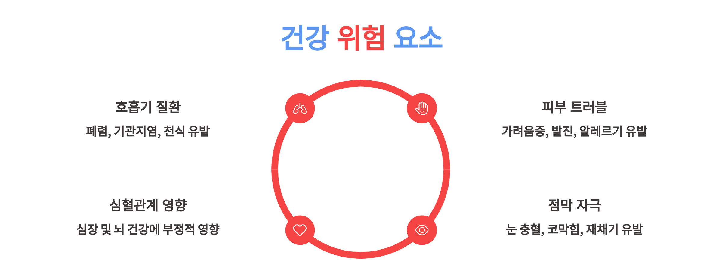 눈 충혈, 코막힘, 재채기 등을 유발하며, 심한 경우 안구 건조증이나 결막염으로 이어질 수 있습니다.